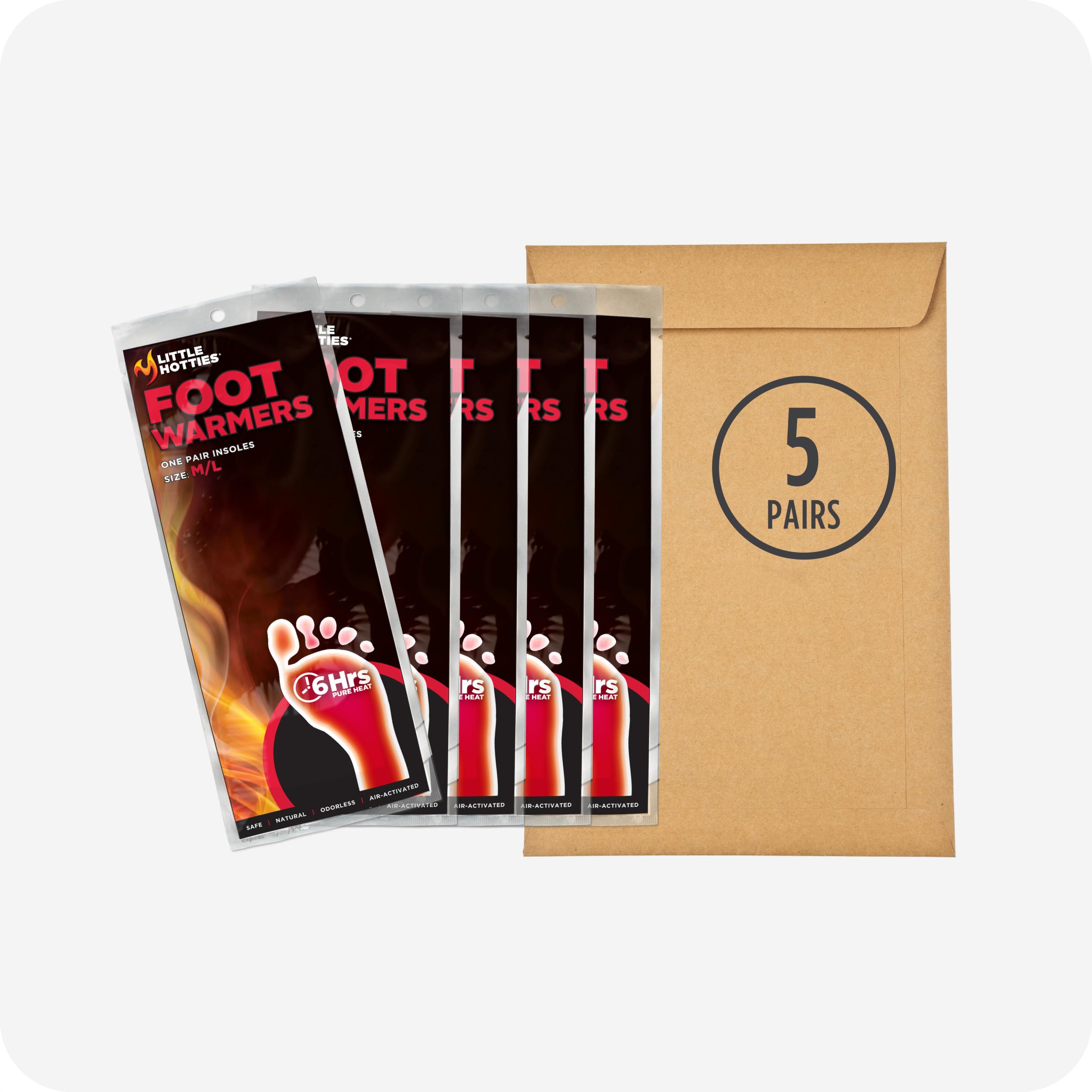 Introducing the Little Hotties Foot Warmer Bundle, the ultimate solution to keeping your feet warm and comfortable during cold weather activities. Each bundle includes five packs of two air-activated foot warmers, providing simultaneous warmth for both feet. Here's why it's a must-have: With up to six hours of continuous heat per pack, these foot warmers are perfect for a full day of outdoor adventures in cold weather. They're designed to be compact, making them ideal for slipping into pockets or inside your shoes, ensuring soothing warmth wherever you go. These foot warmers are odorless, ensuring a pleasant experience during use. The air-activated design means they start working within minutes, providing rapid, comforting warmth. Made with natural ingredients, they're safe for your skin and clothing, with no harmful chemicals to worry about. After use, simply dispose of them with your household waste. Plus, their soft-touch pouch feels gentle against your skin, enhancing your overall comfort. For added convenience, these foot warmers are easily stored in your car, bag, or emergency preparedness kit, ready to deploy whenever you need a little extra warmth. Their simple and straightforward ingredients list contains only a handful of everyday items. Choose the Little Hotties Foot Warmer Bundle for a reliable, safe, and effective way to keep your feet warm and comfortable during cold weather activities.