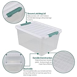 Storage box outside size: 18.5"x13.8"x9.8" Clear storage bin with white lid, green latch, volume 35 Qt Made of durable plastic Latching lids snap firmly to the base to ensure contents stay contained, concealed, and dust-free Great for organizing your home office, garage, or classroom