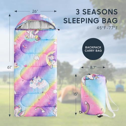 Wake In Cloud - Kids Sleeping Bag for Girls Toddlers, Camping in Warm Cold Weather, Backpacking Lightweight Compact Outdoor Liner for 3 Seasons Summer Spring Fall, Unicorn Rainbow Colorful