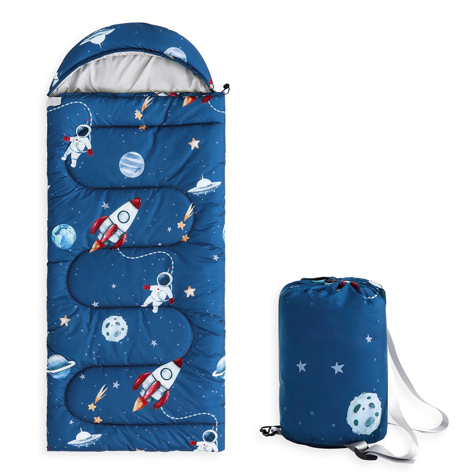 - 3-Season Camping: Features a 210T polyester water repellent outer cover, 240T polyester pongee lining, and extra soft polyester filling; rated temperature from 45F to 77F, whether it is cold or warm weather, our sleeping bag will keep your little one snug and cozy