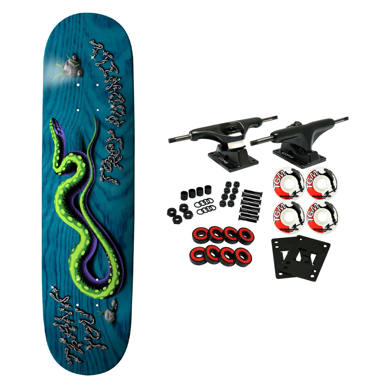 This board comes in assorted colors. Revel in the moments etched in frames that resonate for generations. Photo by Rick Kosick. Constructed with 7-Ply Premium North American Maple. Measures 8.0" wide. Comes with Core trucks, 52mm TGM logo wheels, Amp abec 5 bearings, Black Diamond Griptape, risers, and hardware. Core trucks are light weight and feature heavy duty aluminum with grade 8 steel kingpins and axles, as well as USA made bushings and pivot cups. 52mm 99A are the perfect wheels for both street and park skating. Like the name states, Amp bearings are stimulants for your wheels! Light synthetic oil, Delrin Crowns, and Rubber Serviceable Shields are a few of the things that makes these bearings one of the best Abec 5 rated bearings on the market. Includes professional assembly!