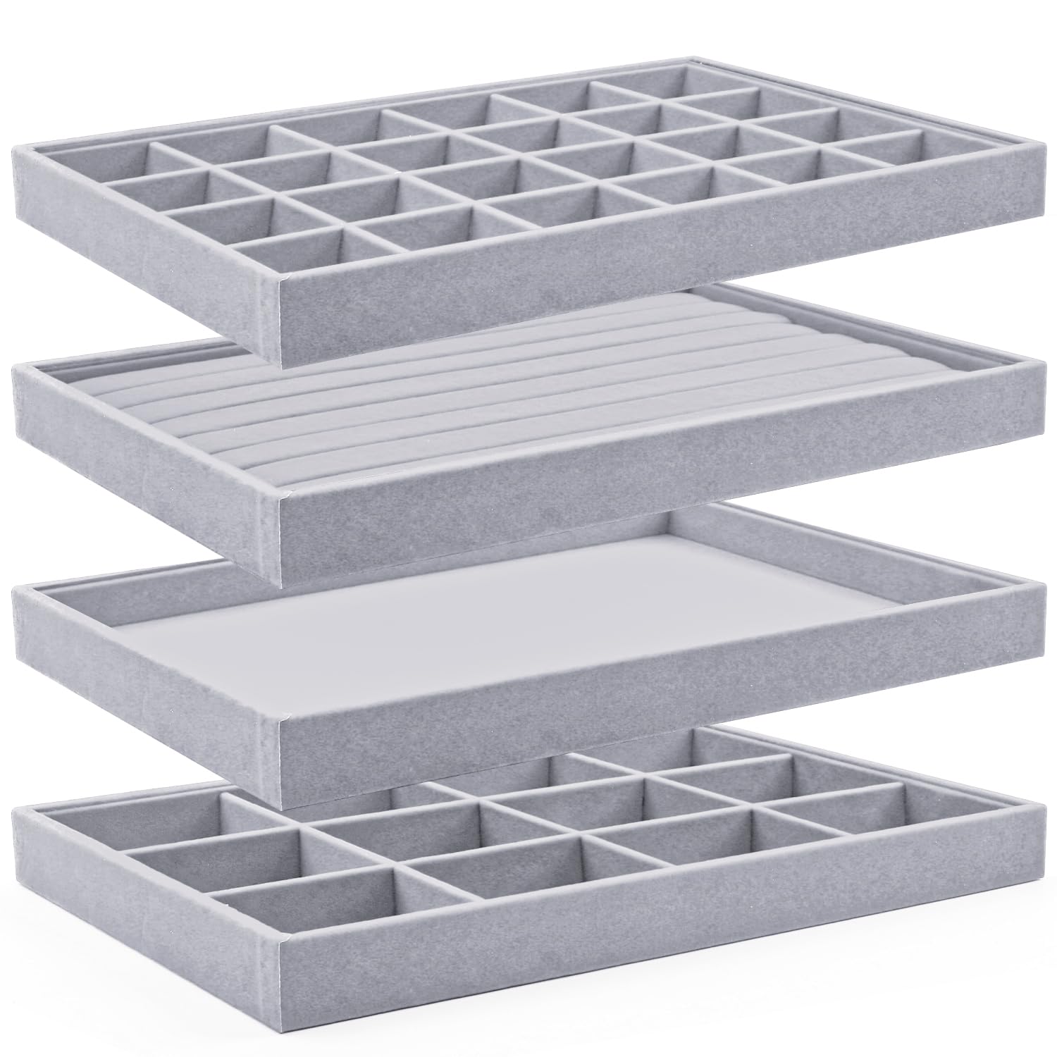 - 4-Pack Versatility Velvet Jewelry Tray- Multiple trays for various jewelry types.Use each tray from the 4-pack for different jewelry items like earrings, necklaces, bracelets, and rings. Enjoy the convenience of our 4-pack set, tailored for comprehensive jewelry organization.The ring display, 12-compartment,24-compartment trays and diaplay tray cater to various jewelry types for easy organization