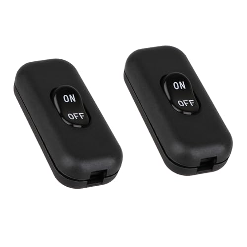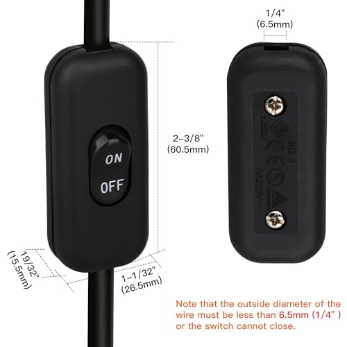- Specifications & Applicable - Black switch, pack of 2. Outside size: L 2.38" x W 1.04" x H 0.61"(60.5x26.5x15.5mm), diameter of both end holes: 0.25"/6.5mm (Note that the outside diameter of the wire must be less than 0.25"/6.5mm or the switch cannot close.) Rated voltage: 250V; Rated current: 6A; The single-pole on/off inline cord switch is lightweight, convenient for wiring and unipolar or bipolar switching, and has good insulation with anti-slip cord grips.