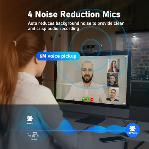 - 4 Noise-canceling Microphones ---- With 4 omnidirectional AI Noise-cancellation microphones and upgraded beamforming algorithm, this usb computer webcams can automatically filter out background noise and echo, keyboard typing and other environmental noises, and deliver a clear voice pick up within the distance up to 6m/19ft