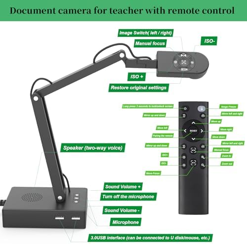 - 12-megapixel document camera is highly versatile, offering zoom in and out, mirroring left/right and up/down, image on/off, speaker volume control, two-way voice calls, LED lighting, ISO adjustments, and the ability to move pictures in any direction. All these functions can be controlled via the remote control buttons. It supports a maximum shooting size of A3 paper