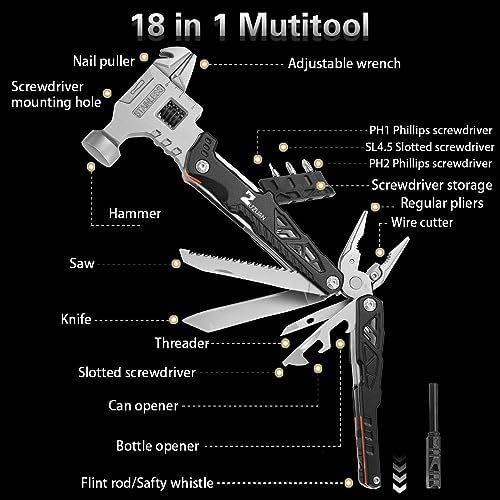 - 【18 in 1 Multifunctional Tool】This multitool is equipped with 18 different functions, including an adjustable wrench, hammer, nail puller, wrench, screwdrivers (PH1, SL4.5, PH2), wire cutter, regular plier, needle nose plier, magnesium rod, safety whistle, bottle opener, can opener, threader, knife, saw, screwdriver hole, and screwdriver storage. With this versatile tool, you will be well-prepared for any task or emergency situation