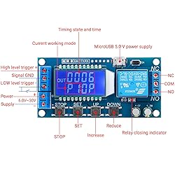 - Product Parameters: Working voltage: DC 6V~30V, support micro USB 5.0 V power supply Working current: 50mA. Static Current: 15mA Max. Output load: DC 30V 5A and AC 220V 5A. Trigger signal source: High level trigger (3.0V~24.0V), low level trigger (0.0V ~0.2V), switching value control (Potential free contact) Service life: more than 100,000 times Working temperature: -40-85°C Additional Functions: a)Automatically hibernation function/ Low power function: In the running interface, long press STOP to open or close automatically sleep function. (L-P selects ON to start the hibernation function, and OFF turns off the hibernation function); b)Relay function selection: In the operation interface, shortly press STOP, the relay function is started or closed, 'ON' meets the conduction condition and the relay normally turns on, 'OFF' meets the conduction condition and the relay does not turn on; In the 'OFF' state, the system flashes 'OUT'. c)Parameters view: In the operation interface, short press SET to display the current parameter setting in the system, without affecting the system normal operation. d)Display content switching: In the P-5 P-6 mode, switch display content (runtime/cycle times) by pressing DOWN. Package Includes: 2* 12V Timer Relay