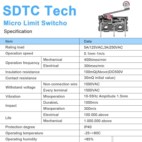 Principle of Operation in Detail: Switches are commonly used to limit the position or travel of mechanical movement. Each switch is a single-pole, double-throw (SPDT) type, with an operating current of 5A, an operating voltage of 250V, and a self-resetting mode of operation. Product Features: Contact Type: 1NO + 1NC Action Type: Instantaneous Actuator type: Roller lever arm 3 pin terminal, handle length approx 16 mm Package Includes: 10 × KW12-3 Miniature Roller Limit Switches Widely Used: These switches have a durable material construction that ensures a long and reliable service life. They are widely used in electronic equipment, automated machinery, etc. and are ideal for ensuring reliable operation of equipment in a particular position or condition.
