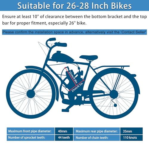 - 【Bicycle Motor Compatibility】IMAYCC bike engines are suitable for most 26-28" wheeled bikes (mountain bikes, cruisers, motorcycles, road bikes) with V-frames. There should be 10" and more clearance between the bottom bracket and top bar of the frame, especially 26" bike. Please confirm the installation space in advance, alternatively visit the ‘Contact Seller'