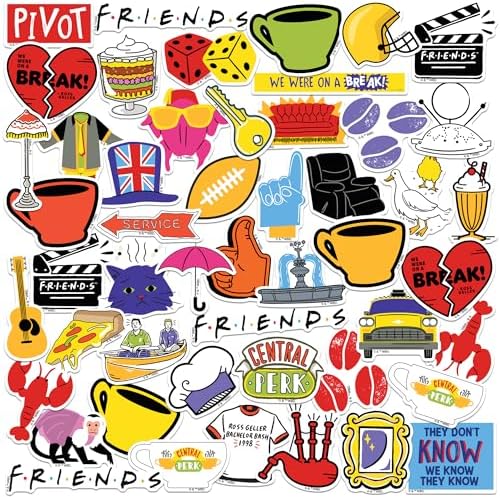 - OFFICIALLY LICENSED DESIGNS: Includes different custom stickers from Friends 50ct Sticker Pack. Perfect to use as water bottle stickers, car stickers, laptop stickers, bumper stickers or planner stickers.