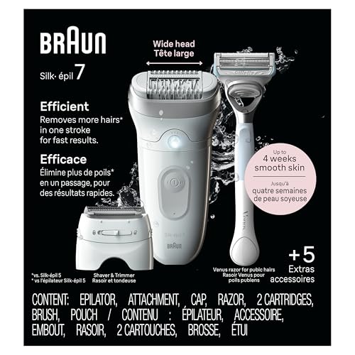Braun Silk-épil 7 Epilator, Wet and Dry, Wide Head, Includes Venus Intimate Razor, Shaver Head and Trimmer Comb, SE7-141