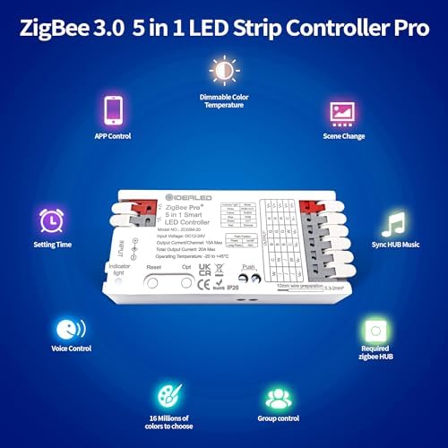 - 【5-in-1 ZigBee LED Strip Controller】This ZigBee 3.0 LED controller is widely used and is compatible with RGB, RGBW, RGBWW/COB CCT LED strips. Just one click to match your ZigBee LED strip type