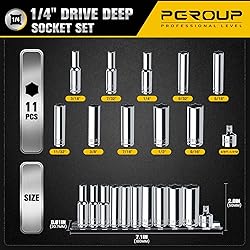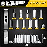 - pgroup 1/4” Drive SAE Socket Set, 11PCS Deep Hex Socket Set (3/16”-9/16”), Cover Most Commonly Sizes, Cr-V Steel with 3/8”F to 1/4”M Socket Adapter