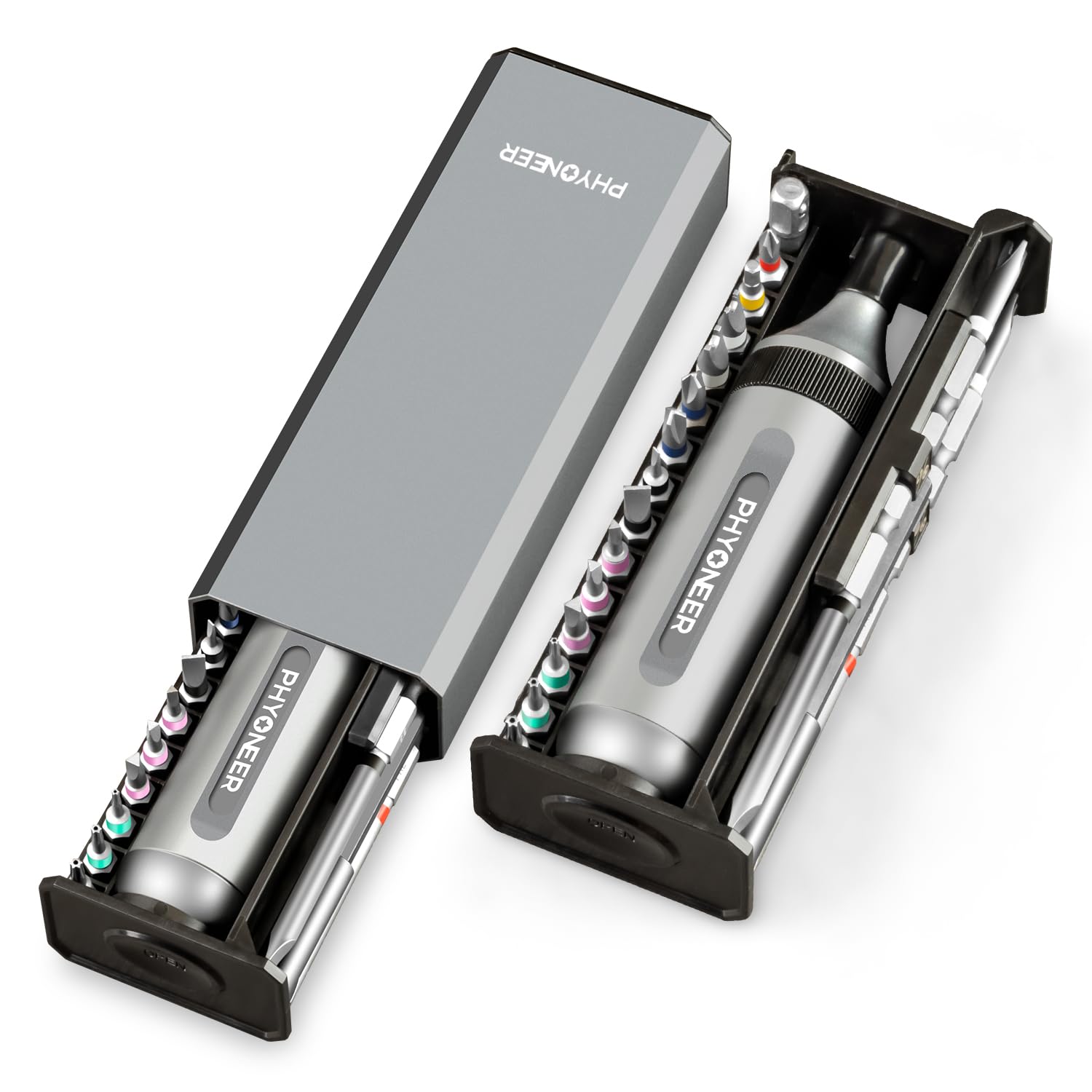 - 【Magnetic Organizer】 The compact screwdriver set with case encasement has a built-in ejection button, which pops out the inner contents with a gentle press. The mini screw driver set kit features a strong magnetic holder in its pocket-sized design, ensuring all bits, including the colored extended driver bits, remain secure, preventing loss or spillage if the case is tilted or dropped.