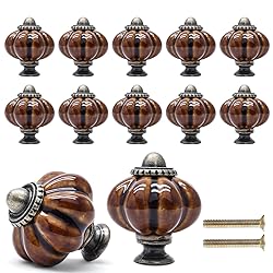 - Product Description Cionyce is a company that pursues high-quality products and takes pride in customer satisfaction, and strives to provide the safest, most satisfactory and most convenient shopping experience for our customers. Cionyce 12 Pack Brown Pumpkin Knobs Ceramic Cabinet Knobs Retro Dresser Knobs Vintage Drawer Knobs Pulls for Vanity, Closet Specification: - Color: Black, Celadon, Dark Green, White, Teal, Sage Green, Periwinkle Blue, Yellow, Light Blue, Brown, Ivory Green, Ivory Blue - Material: Ceramic - Knob Size: 1-3/8" x 1-1/2"(Dia.* L) - Regular Screws: 1" / 25mm Package Included: 12 x Pumpkin Knobs 12 x Regular Screws