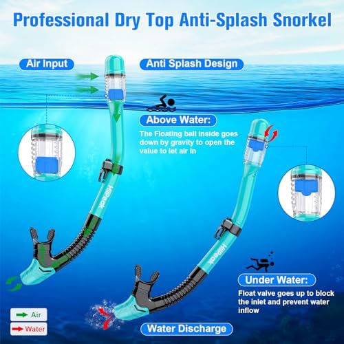 - Safe Snorkeling Experience: Our new snorkel design incorporates an automatic closing valve at the entry point, effectively keeping water out. Whenever you dive into the water, the valve at the top shuts securely and reopens as you surface. Plus, the splash guard ensures no water sneaks in, even during rough waves. And unlike other valves that can get clogged by sand or debris, our valve remains unhindered.