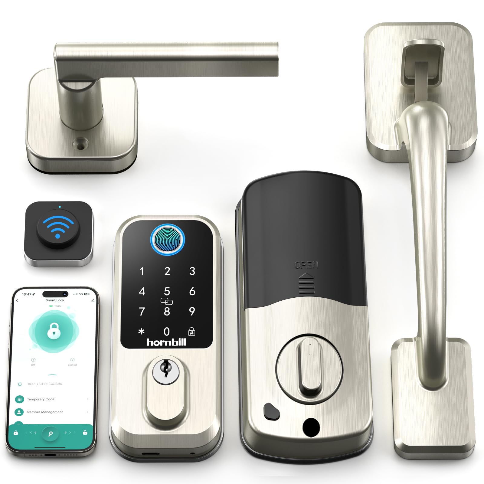 WiFi Smart Door Lock Set: Hornbill Keyless Entry Door Lock Deadbolt with Handle Set Fingerprint Front Door Lock with 2 Knobs Alexa Bluetooth Remote Code Auto Lock for Home Hotel Security Black