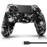 ISHAKO Controller for PS4, Wireless Controller with Double Shock/6-Axis Motion Sensor/Speaker & 3.5mm Audio Jack/Touch Pad/800mAh Battery/USB Cable, Ergonomic Grip – Black Skull Design