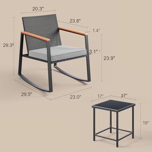 Gizoon 3 Pieces Rocking Patio Bistro Set with Anti-Scald Armrest, Outdoor Patio Wicker Furniture Set with Glass Table and Cushion for Garden, Yard, Porch