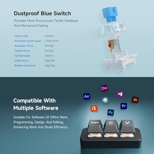- Adopts dustproof blue switch by default, providing more pronounced tactile feedback and mechanical feeling