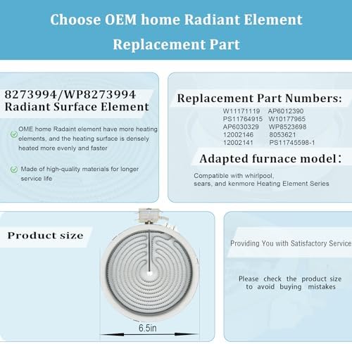 - 【High Adaptability】8273994 W11171119 radiant element is 6-1/2 Inch radiant surface element, compatible with WP8273994, W11171119, PS11764915-1, PS11764915.