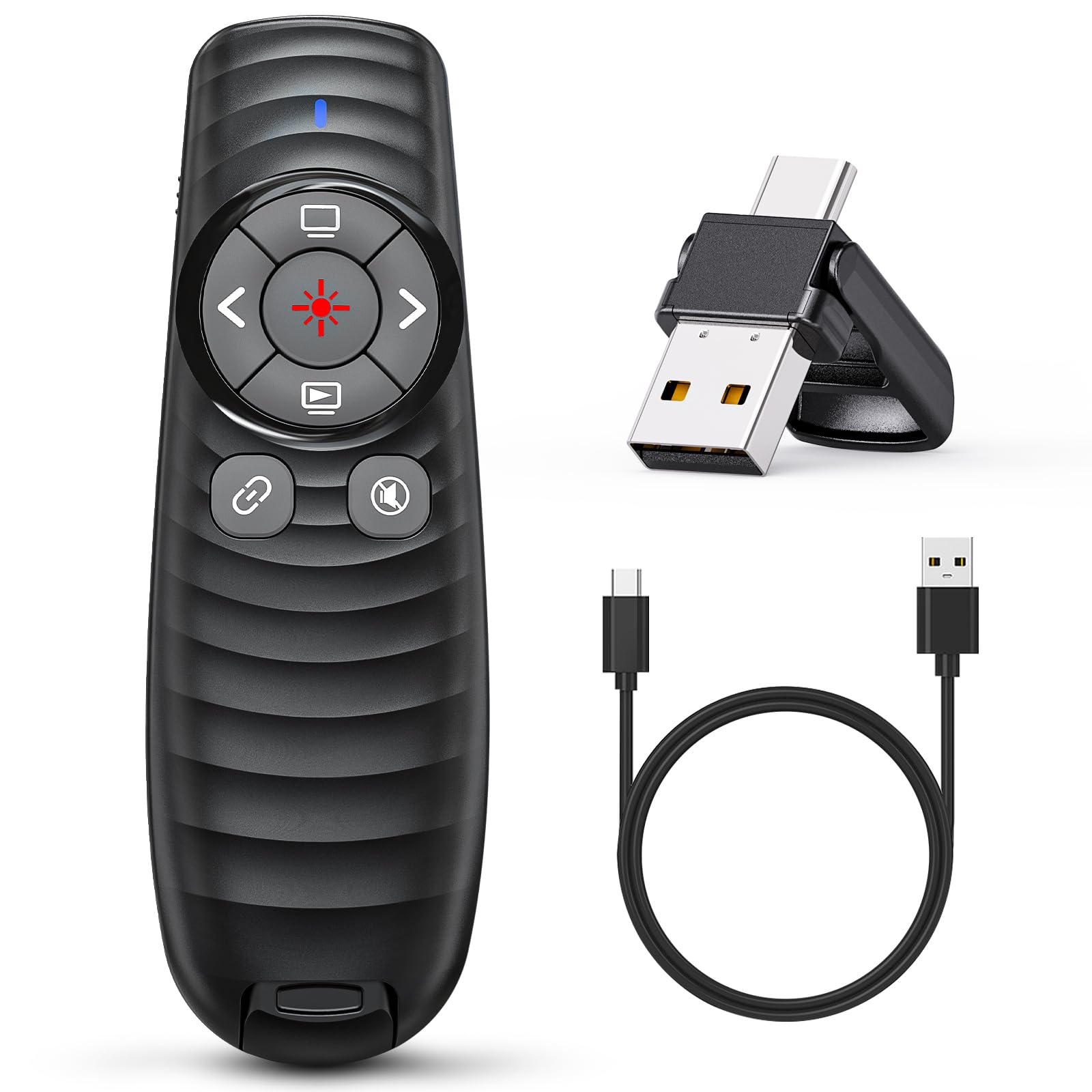 - 2-IN-1 USB TYPE C RECEIVER & RECHARGEABLE BATTERY: Designed with 2-in-1 USB&TYPE-C connector, the wireless computer clicker for presentations is plug-and-play and easy to use. No software is required to install. With built-in rechargeable battery, this presenter clicker is rechargeable via TYPE-C cable. Fully charge the remote clicker for 2-3 hours can maintain to work 7-10 days. The USB C receiver is stored in the remote clicker for presentations to prevent lossing