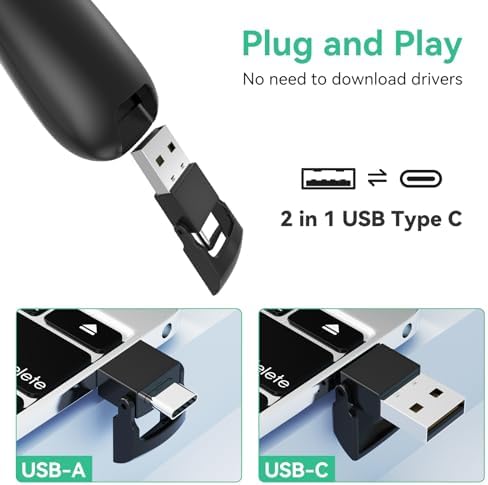 - [USB A & USB C 2 in 1 Receiver, Plug and Play] No installation needed, no assembly or hard instructions to follow. Just plug and play. You simply plug the USB receiver into your computer and start using the laser pointer for presentations. Slide clicker receiver is not only fit for devices with USB A interface, but also for devices with Type-C interface.