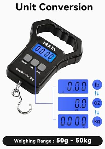 - Specialized Features - HEETA electronic fish scale boasts many functions like data locking, weighing unit conversion, zero function, tare function, auto-off function and overload indication. It not only can be used to weigh fish, but also luggage, package, fruits, vegetables, etc.