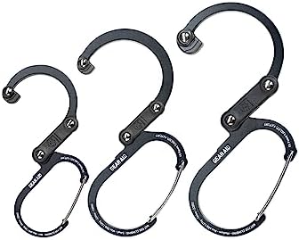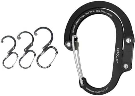 GEAR AID HEROCLIP Carabiner Clip and Hook (Medium, Small, Mini) for Camping, Backpack, Suitcases, Purse and Garage Organization, Stealth Black, Variety Size 3 PackThe ideal size for handling large and awkward items, Heroclip Medium gear clip lets you hook and hang big backpacks from trees, duffle bags from fences, buckets from ladders, and carry-ons from bathroom stalls. The versatile gear clip hangs securely, rotates 360°, and folds compactly in ways other carabiners, clips and hooks can’t, helping you keep your gear organized and exactly where you want it, no matter the activity. The wide carabiner clip gate accommodates bigger stuff compared with standard carabiners and clips, so you can secure anything from extension cord bundles to multiple shopping bags. The hook features a grippy rubber tip for hanging bags and purses from tables and other flat surfaces. Perfect for travel, hiking, backpacks, totes, cables and extension cords, buckets, strollers, purses, shopping bags, suitcases, kids gear, dog leashes, horse bridles and tack, first aid kits, ropes, growlers, trailers, helmets, boots, DIY, EDC, and more.GEAR AID HEROCLIP Carabiner Clip and Hook (Large) for Camping, Backpack, Organization, and Garage, Stealth BlackSay “hello” to the newest super-sized multi-tool to fit your super-sized life and say “goodbye” to fumbling around with your gear! The ideal size for handling large and awkward items, Heroclip Large gear clip lets you hook and hang 100lbs of anything, anywhere, any time. An impressive 40% larger than our Medium clip and Heroclip Large is the ideal choice for sizeable items including suitcases, ice chests, toolboxes, floodlights, outdoor gear, and more of your bigger needs. We made this large hybrid-style clip to support life’s toughest jobs and adventures. Perfect for gym bags, backpacks, suitcases, garage racks, coolers, kayaks, trailers, grocery bags, kids gear, life jackets, bicycles, DIY, organization, family outings and road trips, farm and ranch, sports gear, organization, camping, EDC, and more.