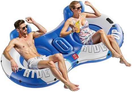 QPAU Inflatable Double River Tube, 2 Person 660lb Capacity, Puncture-Resistant 93" Sturdy Heavy Duty River Float, River Raft with Ergonomic Backrest, Cooler & Cup Holders for Family
