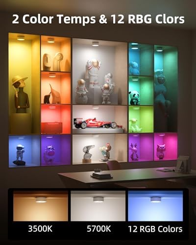 • Twelve RGB Colors & Two Color Temperatures: LED Puck Lights feature 12 RGB colors plus warm white (3500K) and cool white (5700K). Easily switch modes with the remote—one click to change colors. Create the perfect ambiance or turn your home into a spooky Halloween vibe with RGB lighting