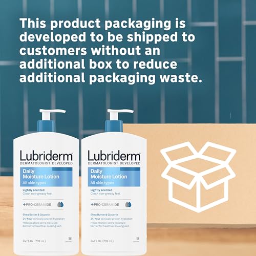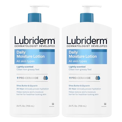 - Twin pack of two, 24-fluid ounce bottles with pump of Lubriderm Daily Moisture Lotion + Pro Ceramide, contains shea butter and glycerin, moisturizes to help restore skin's moisture barrier for healthier-looking skin