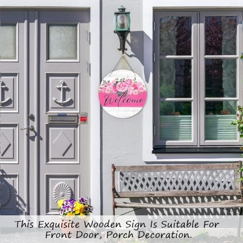 Welcome Door Sign, Flower Decor Wooden Sign Round Decorative Wall Plaque, Blush Pink Floral Welcome Sign for Front Door, Farmhouse Porch Yard Hanging Sign Outdoor Decorations -01