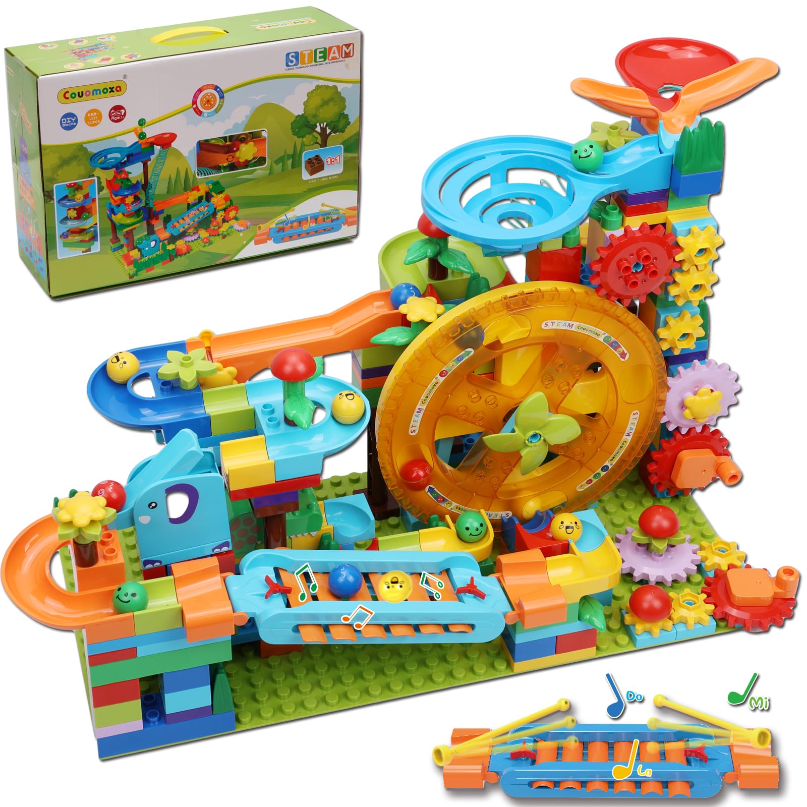 - With rotatable launchers, stackable cubes and a double-sided mat, this 81-piece set with colorful marbles easily creates thrilling games