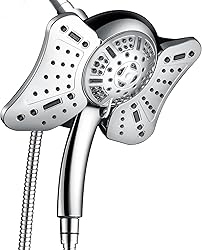 Dual Shower Head: Hand held shower head rainfall shower head combo, combination with up to 19 modes. Enlarged 8.7" panel allows for large area coverage 9 Settings Handheld Shower Head: This shower head with handheld has 9 spray modes to give you different showering experience and meet your multiple needs. Switch black knob of fixed shower head to choose shower water follow out from only fixed shower head, only handheld shower head or both of them and enjoy a wonderful shower moment. No extra shower head stand need, you can just slide the hand held shower head in fixed shower head after using Water Saving Pressure: This shower head adopting the newly developed design of increasing water pressure, even in the case of very low water pressure, it can be rinsed off in a few minutes, bringing you a full-coverage shower experience Superior Materials: The shower heads is made of high-quality chrome-plated ABS eco-friendly material, which will not degrade or release any hazardous substances and will last for years. While ensuring hardness and durability, the double shower head is also effectively insulated. The soft water pipe is made of 304 stainless steel material, which is tough and rust-proof Easy to Install and Use: This shower heads with handheld spray combo Truly easy to install with universal G1/2 threaded connector for any standard shower pipe or water pipe. Easy to install in minutes without any tools, no need to hire a plumber, fits any American Standard shower arm