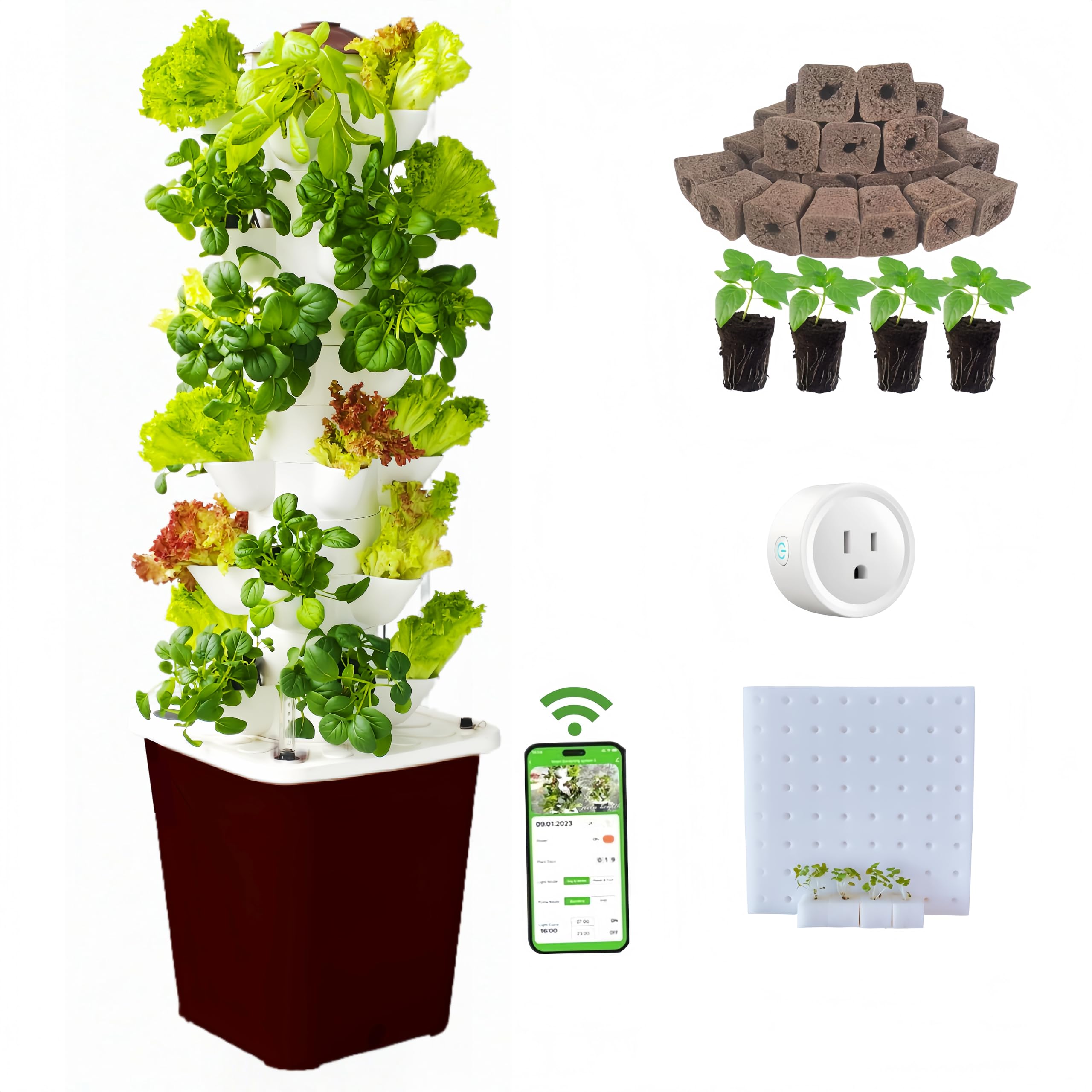 - Simple Setup: Setting up the hydroponic indoor gardening system kit is a breeze with just a few straightforward steps. The innovative water circulation system delivers more oxygen and nutrients to the roots, allowing plants to grow faster than in traditional soil. The kit includes: Six-layer hydroponic tower,One adapter,One water tank,One silent water pump,One timer smart plug,30 coco coir seed starters,64 grow sponges,One water level indicator,One foldable funnel,One planting handbook。
