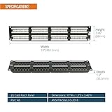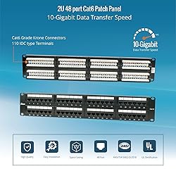 High-Performance Compatibility: The 48-port patch panel is designed to support Cat6 cabling, while remaining fully compatible with Cat5e and Cat5, ensuring flexibility for various network setups Robust Construction: Patch panel is constructed from cold-rolled steel with corrosion-resistant, gold-plated contacts. This cat6 patch panel guarantees faster data transmission and enhanced durability Enhanced Stability: Featuring a detachable rear cable management bar, this patch panel 48 port ensures secure cable positioning, reducing the risk of network issues caused by loose or misaligned cables User-Friendly Design: Ethernet patch panel is designed for ease of use, it offers generous cable space, clear front-and-back labeling, and numbered ports. The T568A and T568B wiring diagrams provide quick reference for simplified installation Comprehensive Kit: Rack mount patch panel supplied with all necessary accessories, including cage nuts, screws, and cable ties. Available in both 24 and 48-port options. It is perfect for high-speed 10 gigabit network environments or standard gigabit ethernet configurations for home or office use