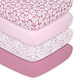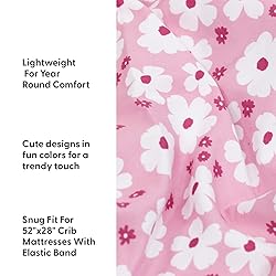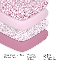 Daisy Sheets: This switch between the pink and mauve floral prints 4 pack crib sheet set in solid shades of pink is the optimal start for your baby girl. Soft & Cozy Comfort: Made from ultra-soft breathable material, to be soft, comfortable, and breathable. These fitted crib sheets provide a smooth and gentle surface for your baby to rest on, ensuring cozy naps and peaceful nights. Universal Fit: Designed with a snug elastic band, these infant crib sheets securely fit 52"x28" crib mattresses, staying in place without slipping or bunching for added safety. Durable & Easy Care: These fitted baby crib sheets are machine washable and built to last, holding their softness and vibrant patterns even after frequent washes, making them practical for everyday use. Breathable & Gentle: The lightweight, breathable fabric sheet mattress promotes airflow to help regulate your baby’s temperature, ensuring a safe and comfortable sleeping environment throughout the night.