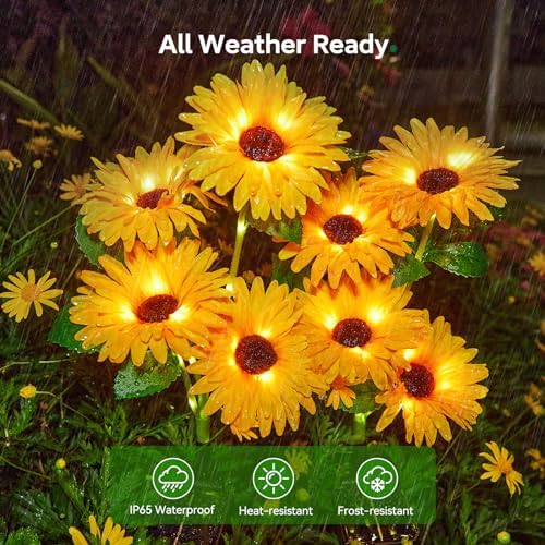- BEAUTY and ELEGANCE SOLAR FLOWERS: Our 4 pack solar garden lights come with 16 bigger solar daisy flowers lights, each petal, leaf, and bud is crafted with exquisite detail, offering a more realistic flower appearance. The daisy-shaped petals and vibrant colors make them a charming addition to gardens, patios, yards, pathways, walkways and driveways at day. When evening, the glowing flowers will bring a touch of beauty to your outdoor space