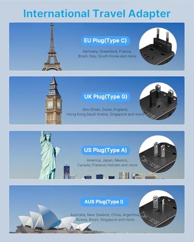 - International Plug Adapter: VINTAR travel power adapter fit for more than 150 countries. Type C Plug: Most of Europe, France, Germany, Italy, Spain, Iceland, Greece, Israel, Korea; Type G plug: UK, Malaysia, Hongkong, Dubai; Type A Plug: America, Canada, Mexico, Thailand, Japan, Taiwan, China(Mainland); Type I plug: Australia, New Zealand, Argentina and more. So it is perfect for your worldwide travel