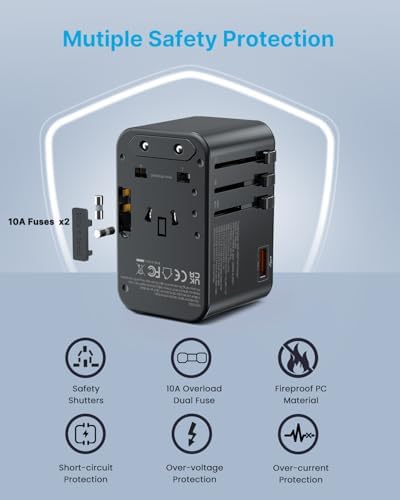 - Safety and Quality Assurance: Advanced GaN technology makes this travel outlet adapter charging faster, cooler and more efficient. Lower charging temperature for longer service life. 10A overload fuse makes it possible to cut off the current in case of overcurrent charging. Fire resistant material makes this adapter non flammable. With safety shutters and plug lock system, supporting short circuit, over voltage and over current protection