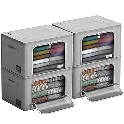 CLOSET STORAGE ORGANIZER SET - (4 Pack) Store and protect clothing and household items with box style containers for organizing your bedroom. CLEAR WINDOW DESIGN - Features 4 clear windows to view contents at a glance with strong zippered flap doors for protection - Metal wire frame sustains shape and avoids flattening contents, and can stand one of the other. EASY ACCESS & CLUTTER-free Organization and Storage - Front and top zipper opening makes it easy to store and remove contents - Secure carry handles allow for easy transport - Zips closed to protect contents from dust, pests, water damage, smells, moths, and more — Card holder allows for easy content labeling. STACKABLE & FOLDABLE, -SPACE SAVING - Sturdy frame stacks above and beneath additional organizers - Tucks away when not in use due to collapsible design - Store on shelves, in larger chests, closets, buffet hutches, garage, basement, attic, or under bed in home, office, dorm — Easy set-up: frame simply pops open into a large storage bins. MULTIPURPOSE - For seasonal clothing, bedding, blankets, comforters, linens, holiday decorations, books, toys, baby clothes, shoes, handbags, and more - Great for storing on shelving units, larger chests, closets, buffer hutches, basements, attics, garages, or under the bed - Made of 100% polyester - Measures approximately 19.75" L X 16" W X 13.75" H