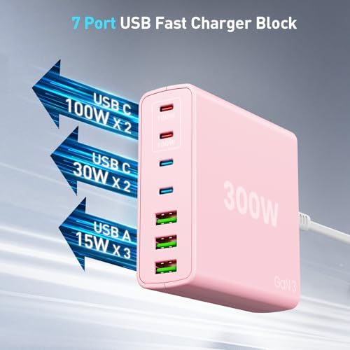 USB C Fast Charger Block 300W: 7 Port USB Charging Station Hub Brick - Dual PPS PD 100W Laptop Wall Charger Power Adapter - Pink