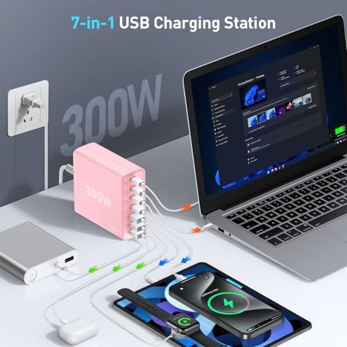 - 7-in-1 Usb Charger Block: For solving the hassle of recharging multiple electronic devices and reducing your accessory burdens, choosing a one for all charger is a better solution. Our USB charger provides multi charging options to meet your different needs. With 4*USB C ports and 3*USB A ports(total 300W), no need for more adapters, you can use just one outlet to plug in laptops, tablets, smartphones, Bluetooth speakers and other small gadgets like earbuds, smartwatches, game consoles etc.