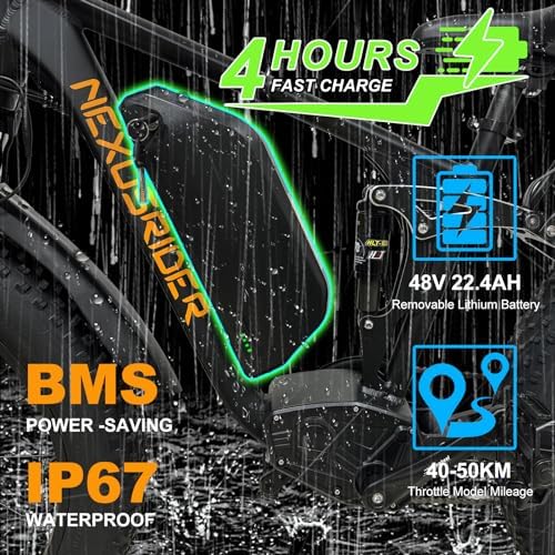 - IP67 Waterproof Battery: 48V 22.4Ah lithium-ion battery is easy for you to remove and charge or place directly on the ebike for charge. 3A charger can fully recharge the battery in 4 hours or more. Waterproof design, no worries in rain or snow.