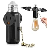 Bulb socket adapter that splits E26 standard base bulb socket into 1 socket and 2 polarized outlets, easy to install without tools. Features a 3-in-1 design with two 3-prong sockets and one E26 bulb socket, allowing independent control for enhanced work efficiency. Equipped with a convenient pull chain switch for easy power control, allowing individual on/off control of the light bulb while not affecting the side sockets. Made of advanced flame-retardant PBT material and highly conductive brass, providing heat resistance up to 329°F (165°C) for durability and safety. Ideal for various applications such as attic, basement, workshop, closet, garage, patio, bathroom, porch, backyard, or any place with a standard bulb socket in need of an outlet.