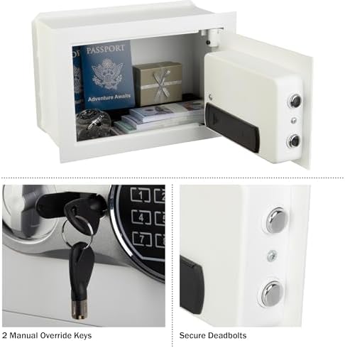 - IN WALL SAFE - Protect your cash, jewelry, documents, passports, heirlooms, and other personal items in this compact digital safe. Enjoy peace of mind knowing that your valuable assets and belongings are secure in this wall lock box safe.