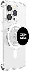 Great for computer programmers, computer engineers and software developers that love to code. MagSafe base attaches the PopGrip to your MagSafe-compatible case (not included). Printed top is swappable with other compatible PopGrip models. Just press flat, turn 90 degrees until you hear a click and remove to swap. Compatible with iPhone 12, iPhone 13, and iPhone 14 models. Works best with smooth, hard MagSafe compatible case. Wirelessly charge your iPhone by sliding off the magnetic PopGrip and setting your iPhone on a wireless charger.