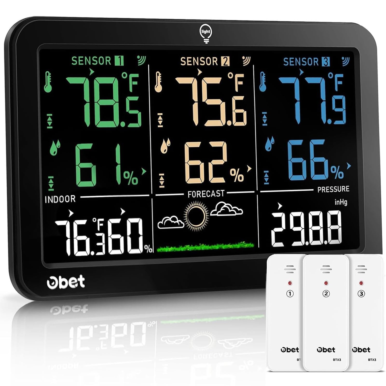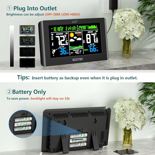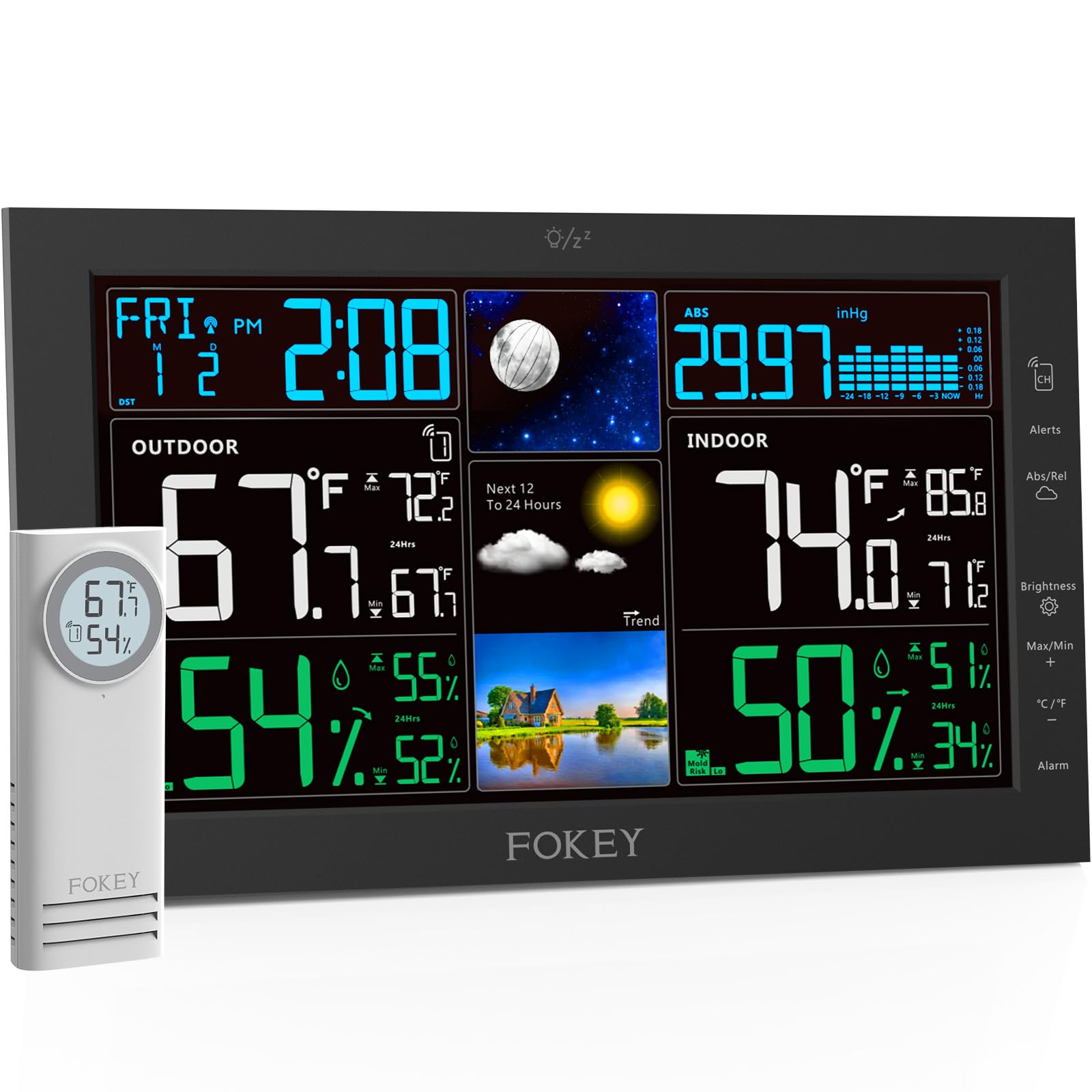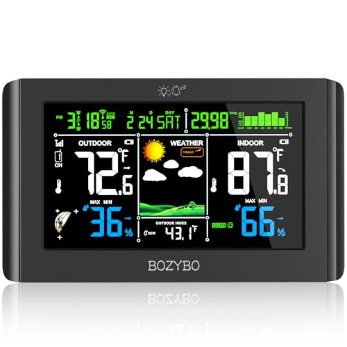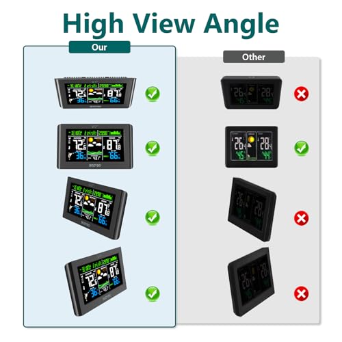 - 7.5" Colorful Weather Station: Equipped with 7.5" HD full color screen visible from any angle. Perfect for placing on a desk or hanging on a wall. Extensive information displayed by this digital hygrometer includes: indoor/outdoor temp and humidity, air pressure and history, moon phase, calendar, atomic clock, weather forecast and trend, outdoor index and more.