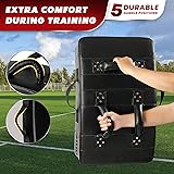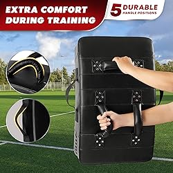 DURABLE MATERIAL & CONSTRUCTION: A football blocking pad crafted with EPE foam heavy duty inside & PU leather outside; Reinforced with solid rivets and bottom laced fastenings, this tackle pad - martial arts training equipment can withstand heavy training 5 MULTIFUNCTIONAL HANDLES: Our football blocking pad features 3 padded PU leather handles and 2 webbing side handles, serving as versatile practice pad, football tackling dummy, kicking pad, kick shield for variety of sports COMFORTABLE & STURDY HANDLES WITH SOLID RIVETS: Reinforce handle structure enhances boxing blocking pads weight capacity to 450 lbs; Foam handle well padded wrapped in PU for impact in contact drills, make it be ideal MMA & basketball training equipment 5" EPE FOAM CORE: Our blocking tackle pad for football training offer balance of density and softness; Ideal for close pitching or contact drill practice, blocking pads are essential football training equipment EASY TO CLEAN: Made with PU leather, our basketball blocking pads for training are low maintenance. Simply wipe down this block and tackle pad with damp cloth after use for effortless cleaning